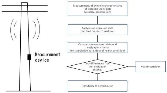 Non-destructive testing (NDT) methods utilizing vibrations [48,49,50,51,52,53,54,55,56,57,58,59,60,61,62] involve propagating guided waves into the interior of utility poles using ultrasonic waves or impact hammers. The deterioration evaluation is conducted by analyzing the waveforms of the received guided waves, propagation speed changes, the utility poles’ natural frequencies following the flow shown in Figure 4 and Figure 5, and their vibration modes.