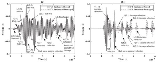 As an example, Jad et al. [48] suggested the possibility of evaluating the embedded length of a utility pole and the degree of damage to the buried section from the propagation wave characteristics of ultrasonic waves propagated into the pole using Micro Fiber Composites for non-destructive inspection of defects in wooden utility poles. In the experiment, an MFC ultrasonic wave generator and sensor were attached to a wooden utility pole, The ultrasonic waves were measured to confirm the changes in the waveforms of healthy poles and damaged poles shown in Figure 6. It has also been confirmed that the measured waveforms can be decomposed and detected using CEEMDAN (complete ensemble empirical mode decomposition with adaptive noise) to more clearly confirm damage. Dackermann et al. [49,50] proposed a method for damage assessment, applying machine learning algorithms to perform pattern recognition and classification of statistically transformed measurement signals to perform damage classification for structural health monitoring (SHM) of wooden utility poles and to assess the health of utility poles, including embedded sections. They also proposed an automatic determination system based on this method. Regarding the problems with the current non-destructive inspection using guided waves, it can only pick up damage in the range where the guided waves propagate. Hence, the evaluation is localized, and it is difficult to evaluate the degree of damage. However, the presence or absence of damage can be evaluated.
