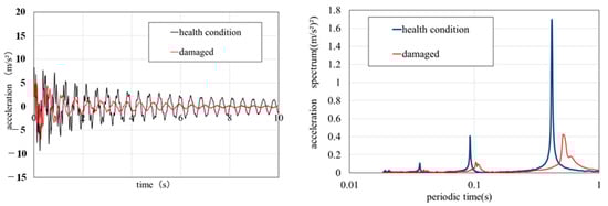 In nondestructive inspection using vibration [57,58,59,60,61,62], the measured acceleration and displacement spectrum are analyzed to check the deterioration of the utility poles following the flow shown in Figure 5. If there is damage, the difference in vibration frequency and decay, which are obtained as vibration characteristics like those shown in Figure 7, can confirm the presence or absence of damage on the utility pole.