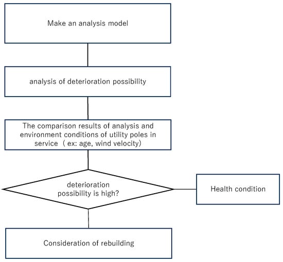 A simulation model of utility poles is created using non-destructive evaluation methods to calculate failure probability [40,41,42,43,44,63,64,65,66,67,68,69,70,71,72,73,74,75,76,77], following the flow shown in Figure 8. This approach evaluates replacement by calculating the probability of failure based on environmental conditions such as wind speed, service life, and dimensions. This method is widely applied to wooden utility poles. Wooden utility poles, rich in organic material, are prone to advanced corrosion. As a result, strength degradation occurs over time, and time-dependent strength degradation prediction models have been proposed [64]. In addition to these models, numerous simulations have been conducted to account for failure probability, considering factors such as wind loads from hurricanes and additional loads generated by the inclination of utility poles.