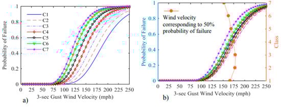 For example, Darestani et al. [70,71] proposed a vulnerability assessment model for utility poles with parameters such as type of pole, length, years in service, number and diameter of wires, span of wires, wind speed, and wind direction. The model of a utility pole shown in Figure 9 is considered. The probability of failure is evaluated for each type of utility pole (class 1 to 7, according to US standards) using the number of years in service, length, wind speed, and other parameters, and a vulnerability assessment model is developed. The figures below summarize the relationship between wind speed and the probability of failure for wooden utility poles of classes 1 to 7, as shown in Figure 10.