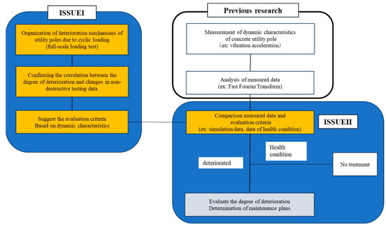The flow of a rational deterioration assessment method for utility poles, as derived from this review, is shown in Figure 12. The evaluation method allows for deterioration assessment by incorporating not only the aspects addressed in previous studies but also insights gained from understanding dynamic characteristics based on experimental results (ISSUE I) and establishing boundary values for the measured vibration characteristics (ISSUE II).