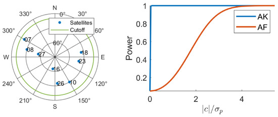 Tropospheric AK and AF power function curves, computed using their noncentral Chi-square CDF. Left: single-epoch GPS skyplot; Right: single-epoch, L1 GPS, , ambiguity-float (AF) and ambiguity-known (AK) power function curves for tropospheric zenith delay testing.