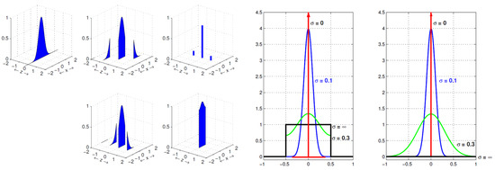 in which is the PDF of and is the indicator function of the pull-in region of the integer estimator . The PDF of the integer ambiguity residual was already given in [18], Equation (19). Figure 2 (Left) illustrates stepwise (in blue) how it is obtained from in the one-dimensional case. The PDF of (top left) is shown along the x-axis, the PMF of (top right) along the z-axis, and the joint PDF (top middle) is shown in the -plane. This joint PDF consists of slices of translated along the z-axis to the corresponding integers z. The joint PDF of and (bottom left) follows from translating the slices along the x-axis so that they are all centered at the mean value: in this case. The PDF of (bottom right) is then finally obtained by summing over z, i.e., all slices are again translated along the z-axis to the origin. Figure 2 (Right) shows how the shape of the PDF of the ambiguity residual changes with the ambiguity standard deviation and how, under these changes, it compares with the ambiguity-float PDF . It shows that the difference between the two distributions becomes lower the smaller the standard deviation gets.