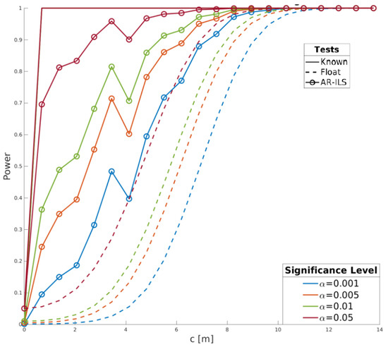 To obtain a first insight into the expected performance of the MIM test, we consider two of its limiting cases in Section 3. In the first case, the integerness of the ambiguities is not taken into account, while in the second case, the integer ambiguities are assumed to be known. The first is referred to as ambiguity-float (AF), while the second is referred to as ambiguity-known (AK). In both these limiting cases, the MIM test becomes equal to a -test with well-known power functions (i.e., functions that provide, for a given false-alarm probability, the detection probability as a function of the biases). It is shown that for carrier-phase GNSS, the AK power significantly outperforms the AF power, i.e., when the ambiguities are assumed known, the carrier-phase observables start to act as very precise pseudoranges, thereby contributing significantly to the power improvement of the test. The AK test, however, is not an operational test, since in the case of carrier-phase GNSS, the ambiguities can never be assumed as known, i.e., despite the fact that the ambiguities are known to be integers, they still remain unknown.