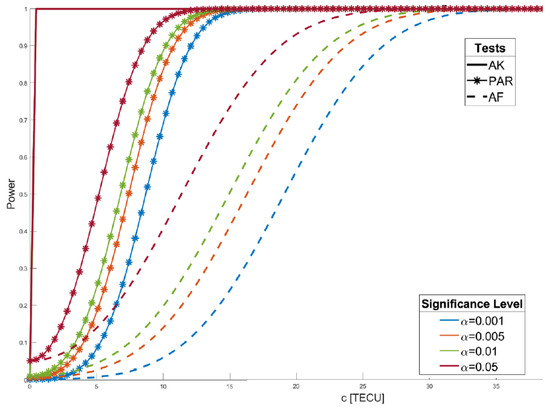 Although the ambiguity success rates are not required to be as large as needed for ambiguity-fixed GNSS baseline estimation [1], it is clear from the above considerations that they still play a driving role in the performance of the ambiguity-resolved tests. Since it may happen that full ambiguity success rates become drastically reduced when switching from to , particularly when the dimension of c increases, partial ambiguity resolution (PAR) is a strategy to keep the reduction in ambiguity success rate at bay. This is illustrated for ionospheric testing in the example of Figure 4. It shows how PAR can obtain large success rates, thus enabling the conditions of Theorem 1, thereby significantly improving the power compared to that of AF testing.
