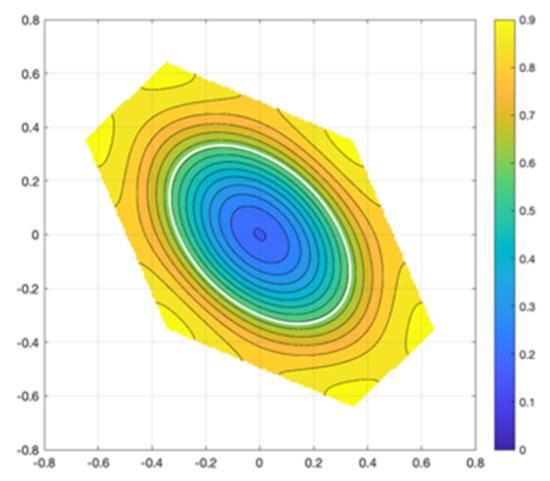 As an example illustration, we consider the single-epoch, dual-frequency, two-satellite GNSS geometry-free model [1]. The ambiguity bias vector under , propagated into the ambiguity residual , is denoted as . This bias vector is, like the ambiguity residual , confined to the origin-centered pull-in region of the integer ambiguity estimator. Hence, the domain of the power function is confined to this pull-in region as well, which, in case of ILS estimation, is a hexagon. Figure 5 shows, for when is chosen as the ILS estimator, the contour aligns with the color bar of the power function . It clearly shows how the power increases as the ambiguity bias vector moves away from the origin towards the edges of the ILS pull-in region.
