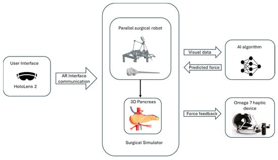 Following the introduction, the paper is structured as follows: Section 2 details the methodology for developing the simulator, covering the parallel robot design, the CNN-based force prediction model, and the integration of augmented reality and haptic feedback. Section 3 presents the results, focusing on system performance and user evaluations. Section 4 discusses the simulator’s contributions to surgical training, highlighting its benefits and areas for improvement. Finally, Section 5 concludes by summarizing the simulator’s potential for advancing robotic-assisted surgical training.