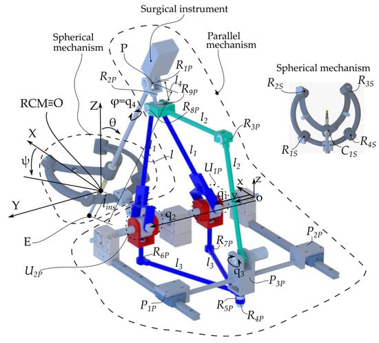 The second module is an active 4-DOF Parallel Mechanism (PM) with three kinematic chains. The first one consists of the q1 and q2 active prismatic joints connected to the links l1 through the U1P and U2P universal joints. The l1 links are connected through the R9P passive revolute joint. The second parallel kinematic chain consists of the same q1 and q2 active joints connected to the links l3 through the R6P and R7P revolute prismatic joints. The l3 links are connected through the R4P passive revolute joint. This kinematic chain is connected to the third kinematic chain through the revolute joint R5P. It is a serial kinematic chain constating of the following joints: the active revolute joint q3 and the passive revolute joints R3P and R8P connected through the l2 links. The surgical instrument is connected to the 4-DOF parallel module through a universal joint consisting of two passive revolute joints (R1P and R2P) intersecting in point P, as the center of the revolute joint R1P.