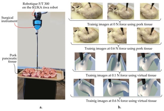 The data were collected by recording videos of tissue responses under applied forces ranging from 0 to 1 N using a Kuka iiwa LBR 7 R800 robot (provided by KUKA AG, KUKA Aktiengesellschaft, Zugspitzstraße 140 86165 Augsburg, Germany), equipped with a Robotiq FT 300 force–torque sensor (provided by Robotiq, Robotiq Inc., 966 Chemin Olivier, Suite 500 Lévis, QC, G7A 2N1, Canada) and an endoscopic camera (provided by Olympus Corporation, 3500 Corporate Parkway, Center Valley, PA 18034, USA) (Figure 5).