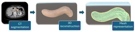 For a detailed representation of the soft tissue, the organ was reconstructed from CT scans. The process was carried out in Slicer 3D [21], where the targeted organ was segmented using the Total Segmentator module [22]. This method separates the targeted organ by analyzing color differences between pixels in the CT slices. After segmentation, the organ was reconstructed, and the model was exported as a 3D object. The final object was then imported into Unity, where custom textures were applied to give it a more accurate appearance of porcine tissues. The workflow for patient-specific pancreas modeling consists of CT segmentation of the organ, followed by 3D reconstruction, and mesh representation for simulation purposes, as illustrated in Figure 6.