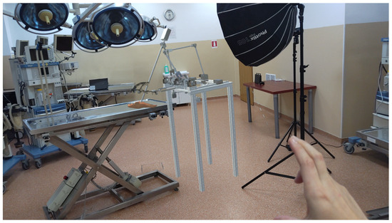 The integration of the robot as a hologram into the operating room (Figure 7) provides a powerful tool for both the developers and the medical professionals. By using HoloLens 2, the robot is projected as a 3D hologram, enabling real-time visualization and interaction during surgical procedures. This allows developers to test and refine the robot’s functionality in a realistic, immersive environment without the need for physical prototypes. For medical professionals, holographic representation enhances their understanding of the robot’s movements and capabilities, facilitating more precise control and decision-making. Furthermore, this augmented reality setup improves collaboration between the medical team and the robot, ensuring the integration of robotic assistance during surgery, and ultimately contributes to better patient outcomes.