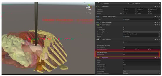 Poisson’s ratio of the pancreas, typically between 0.45 and 0.5 [24], was incorporated into the deformation model by simulating volume conservation during compression. In Unity, the Rigidbody component was utilized to apply forces along the z-axis, mimicking compression. To prevent lateral movement, the rigid body’s constraints, FreezePositionX and FreezePositionY, were selected. To replicate the tissue’s resistance to lateral expansion under compression, this restricted expansion in the x and y directions maintained the volume constant throughout deformation. To detect collisions, a mesh collider was added, directing the deformation-based mesh vertices. When forces are applied, the positions of the vertices are adjusted to reflect interactions with the surgical instruments, allowing for realistic, local deformations based on the collisions.