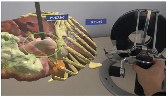 The AR environment highlighting the force prediction in HoloLens: the hologram of the pancreas is on the left and the instrument pressing on the tissue and the haptic device are on the right.