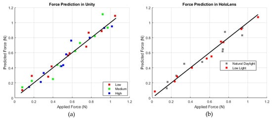 Figure 10 displays plots comparing predicted force (N) to applied force (N), with a diagonal line representing a perfect correlation between the two. In the Unity plot, data points corresponding to low, medium, and high brightness levels (shown in red, green, and blue) remain consistently close to the diagonal, indicating stable accuracy across different lighting conditions. Conversely, the HoloLens plot, with gray markers for natural daylight and red markers for low light, shows that the red (low-light) data points are positioned closer to the diagonal, suggesting improved prediction accuracy in low-light environments. This indicates that while Unity exhibits consistent performance regardless of brightness, the HoloLens model performs best under low-light conditions, with slightly reduced accuracy observed in natural daylight.
