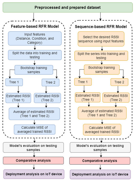 The developed models were then compared with our predecessor ANN(F) and ANN(S) models. ANN(F) and ANN(S) models have also been designed previously to estimate wireless channel in LP-IoT devices using ANNs [30]. These models employ the same Featured and Sequenced techniques as the RFR(F) and RFR(S) models. Finally, we deployed developed models on the Raspberry Pi 4 model B to analyse the complexity of the developed models. Figure 2 illustrates the process flow used in this research to estimate the RSSI. Following the explanation of the research process flow, we delve into the detailed explanation of implementing the RFR(F) and RFR(S) models for the LP-IoT channel gain in the subsequent section.