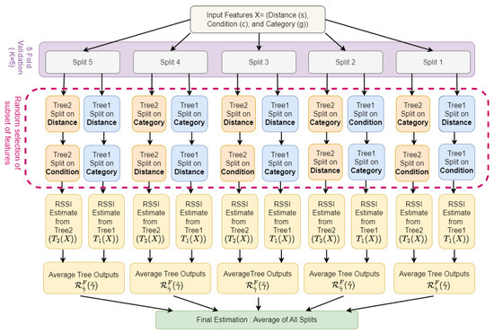 In the RFR(F) model, we utilised three LP-IoT channel environment features such as the distance between the transmitter and receiver, the environment condition (Line-of-Sight (LoS) and Non-Line-of-Sight (NLoS)), and the category showing the fixed location, varying location, or varying distance and location between the transmitter and receiver [30]. We input the three features into the RFR model to estimate the RSSI against those features. The following equation expresses the high-level RFR(F) model mathematically: