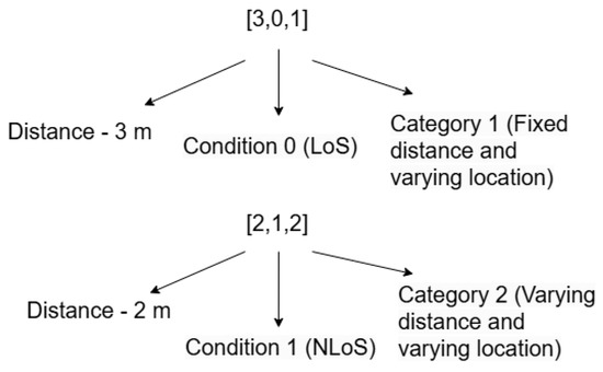 In the Sequence-based strategy, we select a specific subset of data from a prepared dataset that contains RSSI values. The prepared dataset is structured with three primary features: distance, condition, and category, as explained in Section 4.1. A combination of these features, such as , is used to select the corresponding RSSI series. Specifically, this combination selects RSSI values where the distance is 3 m, the condition LoS has a value of 0, and the fixed location of the receiver has a category value of 0, as shown in Figure 4. The selected subset of RSSI values, extracted from the dataset’s fourth column, is then transformed into a time series. Then, we feed the selected RSSI series into the RFR(S) model for training and estimation. The high-level expression of the RFR(S) model is as follows:
