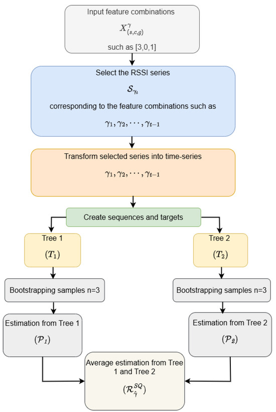 where represents the final estimation through the RFR(S) algorithm with two estimators, such that , trained through bootstrapping on historical data to map the lagged RSSI values to future values; T represents the number of trees in the RFR model and is the estimation from the tree in the forest. These representations model the RFR(S)’s operation for time series forecasting by utilising the dependency of future RSSI values on past observations through an ensemble learning approach, as shown in Figure 5.