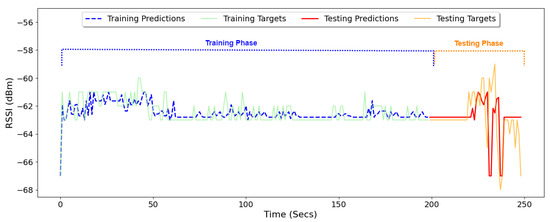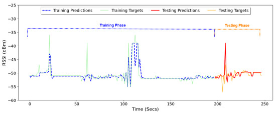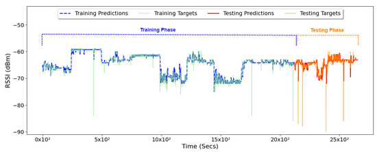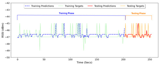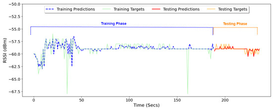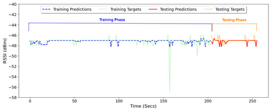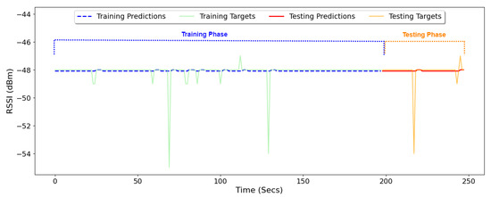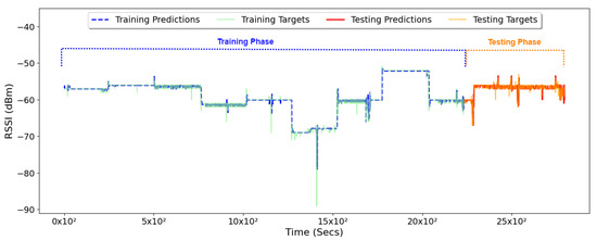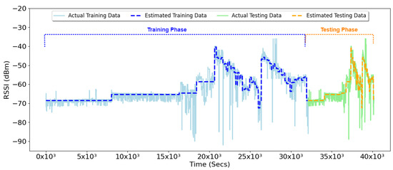 For the RFR(F) model, the training and testing phases are visualised in Figure 6, while the estimation outcome—including the training error (MSE,RMSE), testing error (MSE,RMSE), training time and testing time, are detailed in Table 2. The training MSE of dBm, along with the testing MSE of dBm, indicates the higher accuracy of this model. The training time of 0.0134 s and the testing time of 0.0010 s signifies the model’s efficiency. In an RFR(S) model, we utilised a variety of feature combinations such as and . These combinations show the LoS and NLoS conditions with a fixed distance of 3 and varying receiver locations. Similarly, the combinations from to show the LoS and NLoS conditions with varying receiver distances and locations. The RFR(S) model’s outcome using these feature combinations demonstrates the model’s viability in handling the different RSSI series. Figure 7, Figure 8, Figure 9, Figure 10, Figure 11, Figure 12, Figure 13 and Figure 14 illustrate the training and testing phases for the selected sequences of feature combinations. We evaluated the model’s performance by obtaining the MSE, Root Mean Squared Error (RMSE), training time, and testing time across these selected sequences. The estimation outcome of the selected RSSI series can be visualised in Table 3. Additionally, it is to be noted that the RFR(S) model (in Table 3) demonstrates varying levels of MSE across different sequences during the training and testing phases. For instance, the sequence using features shows the training MSE of dBm during the training phase. During the testing phase, there is a slight increment in the MSE of dBm. Despite these variations, the RFR(S) model demonstrates relatively lower MSE, RMSE, training, and testing times across all sequences, which indicates high computational efficiency.