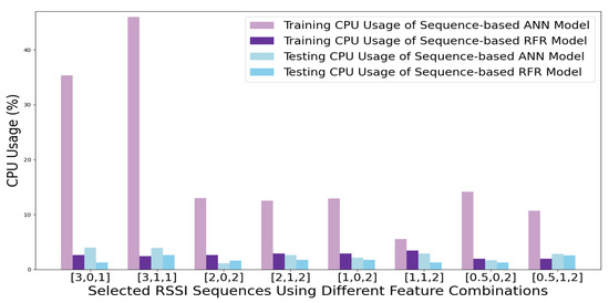 To analyse the complexity of the RFR(F) and RFR(S) models over ANN-based models, we deployed these models on Raspberry Pi 4 Model B. We focused on analysing the lightweightness of the models through key parameters such as CPU utilisation, average of four cores in (%), and memory usage in (MBs) during the training and testing phase. From Table 4, we can see that the RFR(F) demonstrates a considerable advantage in terms of resource efficiency. During the training phase, it consumes significantly less memory, 923 MBs, compared to the ANN(F) model with 1095.68 MBs. Also, it utilises only of CPU, while the ANN(F) utilises . During testing, the RFR(F) maintains lower memory usage and CPU utilisation compared to the ANN(F) model, which shows no reduction in memory usage but a drastic decrease in CPU utilisation to . Finally, we compare the CPU utilised by the RFR(S) with the ANN(S) model for the selected RSSI series, as illustrated in Figure 15, indicating the CPU utilisation in the training and testing phase of the RFR(S) and ANN(S) models. It is visibly clear that the ANN(S) utilises a higher CPU during training. However, the testing usage was less than RFR(S) only for the sequence with features . In the testing phase, both models show decreased CPU usage; however, the ANN Model still exhibits overall higher resource consumption than the RFR Model. Considering the combination of training time, memory usage, and CPU utilisation in training and testing as complexity parameters, we can observe the significantly greater efficiency of the RFR(S) model over the ANN(S) model. The reduced CPU usage during the testing phase of both models is obvious, as this task involves only evaluating the already trained models.