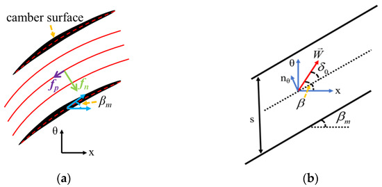 Illustration of the BFM: (a) normal/parallel force decomposition; (b) schematic diagram of blade metal angle and relative velocity.