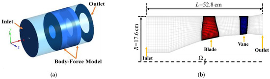 In order to validate the BFM method, a full three-dimensional numerical simulation was conducted to solve the three-dimensional steady RANS equations. The full-annulus computational domain and blade mesh of the fan stage are illustrated in Figure 4. The total number of grids was approximately 27.7 million. The boundary conditions were set to be consistent with those in the BFM calculation method. The rotor–stator interface was set as a mixing plane. The wall was set to a no-slip adiabatic wall. The convergence time of a single case based on the RANS method using the same computational resources was approximately 12 h. The convergence of the iterative solution was monitored by the residuals of the mass, momentum, energy, and turbulence model equations. The required root mean square (RMS) residual order of accuracy was less than 10−6.