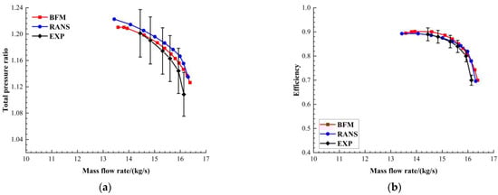 The aerodynamic characteristics of the fan stage at design rotation speed (100% RPM) are presented in Figure 5. The experimental results were obtained from the test rig at the Civil Aviation University of China, with a relative error band of 3%. It can be found that the results obtained using the BFM method are in good agreement with the numerical simulation results (RANS) and experimental results (EXP). The isentropic efficiency obtained using the BFM method is slightly higher than that obtained using the RANS method. The maximum deviation is not more than 2 percentage points. This can be explained by the fact that only the work and deflection of the blade acting on the airflow are considered, and three-dimensional flow losses, such as tip leakage flow loss and secondary flow loss near the endwall region, are neglected. The mass flow rates at the near-choke point obtained using the numerical simulation method (both the BFM and RANS methods) are slightly higher than the experimental results. This can be attributed to the blockage effects of the centrifugal compressor, combustion chamber, and turbine in the DGEN 380 engine test, which lead to a reduction in the mass flow rate through the fan. Therefore, the experimental result of the mass flow rate at the near-choke point is slightly lower than that of the numerical simulations.
