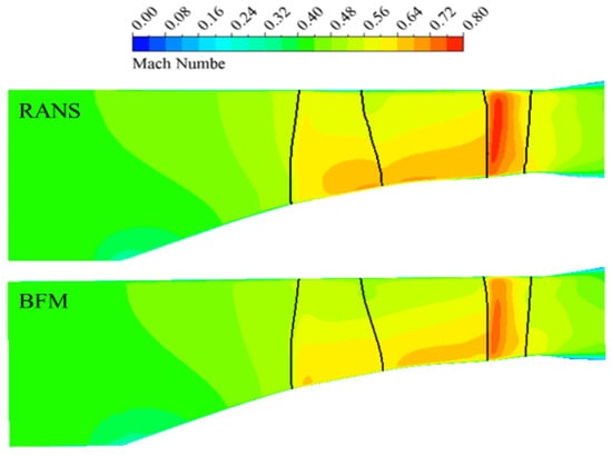 The Mach number contours in the meridional plane are illustrated in Figure 6. It can be observed that the results obtained using the BFM method agree well with the RANS results. The body force model can accurately simulate the work performed by the fan stage and the flow loss in the boundary layer near the endwall region. In the rotor and stator regions, the Mach numbers obtained by the BFM method are lower than those obtained by the RANS method. This is because the BFM method does not consider the effects of secondary flows, such as tip leakage flow and endwall passage vortex.