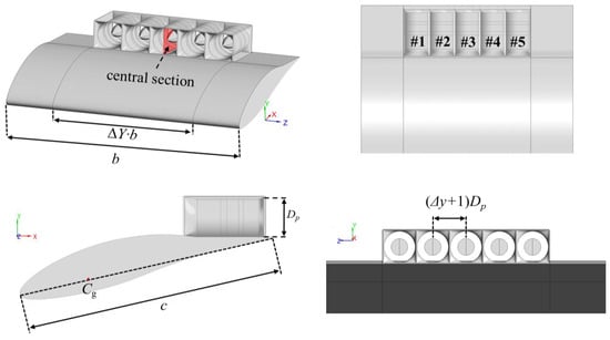 To investigate the influence of the internal and external flow coupling effect on the aerodynamic–propulsion coupling characteristics of the distributed propulsion system and consider the impact of boundary layer ingestion on the inlet distortion of the ducted fan, the NACA 643-618 airfoil and the DGEN 380 engine fan are integrated into a model with five ducted fans over the wing. The symmetrical integrated model is illustrated in Figure 7. The geometric parameters of the integrated model are listed in Table 2, with reference to the typical layout of distributed ducted fans [26]. The separation distance between the fans, , is the minimum distance between two neighboring fans in the spanwise direction. To minimize the inlet flow velocity and improve the benefit of boundary layer ingestion, the ducted fan array is placed at the trailing edge of the upper surface of the wing at . The ducted fans are numbered from left to right in the spanwise direction of the wing, in sequence from #1 to #5.