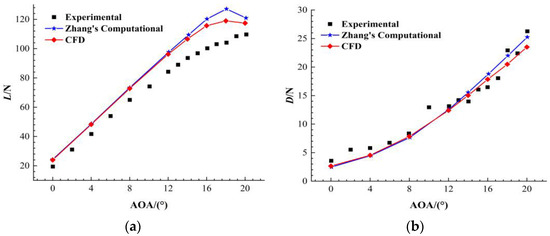 The variations in lift and drag with the inflow angle of attack (AOA) for the NACA 4415 wing are presented in Figure 9. It can be observed that the variations in the lift and drag with the angle of attack agree well with the experimental and numerical simulation results [10]. At low angles of attack, the numerical simulation results obtained in this study coincide with those reported in the literature. Near the critical angle of attack, there are slight deviations in lift due to the simplification of the wing model and CFD methods. However, the lift and drag values obtained in this study are closer to the experimental results. Overall, the numerical simulation method still has high reliability in rapidly evaluating the characteristics of wing flow fields.