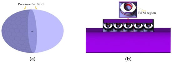 The five-ducted-fan over-wing integrated model is numerically solved using FLUENT software. The circumferential body force model is used to simulate the force of the blades acting on the airflow, and the BFM is loaded in the red region, as shown in Figure 10b. For each iteration, the body force source term is updated accordingly. In other regions, the three-dimensional steady RANS equations are solved using the k-ω SST turbulence model, which has significant advantages in addressing near-wall and separated flows and can accurately capture complex flow. The air is modeled as an ideal gas following Sutherland’s law for viscosity. An implicit coupled density-based solver is employed, and the wall is set to a no-slip adiabatic wall. The far field is spatially discretized using the finite volume method, and the second-order upwind scheme is selected as the discretization scheme. Based on the designed cruise altitude of the DGEN 380 engine, the pressure far-field boundary condition is set at an altitude of 3 km, with the atmospheric pressure being 70,108 Pa and the atmospheric temperature being 268.65 K. The flight Mach number ranges from 0.2 to 0.5.