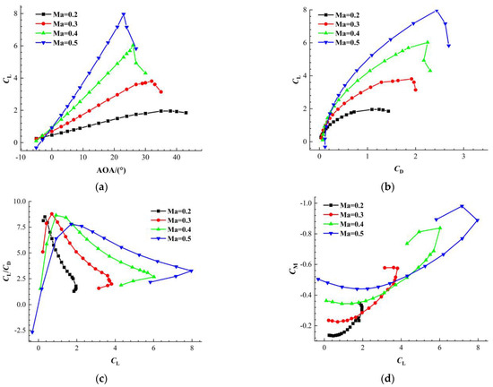 Under the condition that the physical rotational speed of the fan remains constant, Figure 11 presents the variation laws of the wing lift coefficient with the incoming angle of attack, the variation relationship between the lift coefficient and the drag coefficient , the lift-to-drag ratio, and the variation relationship of the pitching moment coefficient with the lift coefficient in the Mach number range from 0.2 to 0.5. These coefficients are defined as follows: