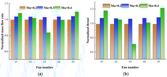 The variations in the mass flow rate and thrust of each ducted fan with the flight Mach number at an angle of attack of 26° are presented in Figure 12. The normalization of the mass flow rate and thrust is carried out with reference to the corresponding values of the middle fan (#3) when the angle of attack is 0° and the Mach number is 0.2.