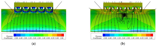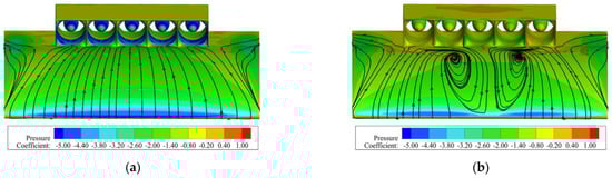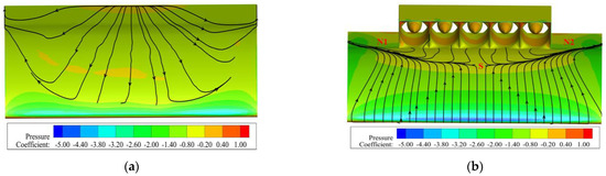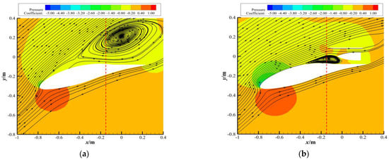 Figure 13, Figure 14 and Figure 15, respectively, present the flow characteristics of the NACA 643-618 clean airfoil and the coupled configuration without the fan suction effect under the conditions of a Mach number of 0.2 and an angle of attack of 26° from different perspectives. Figure 13 shows the static pressure coefficient contours and limiting streamlines on the upper surface of the wing, Figure 14 presents the streamline distribution at the middle section of the wingspan (as shown in the red section of Figure 7), and Figure 15 shows the axial velocity contours at the x = −0.15 m section (corresponding to the red dashed line in Figure 14). The static pressure coefficient is defined as follows in Equation (14):