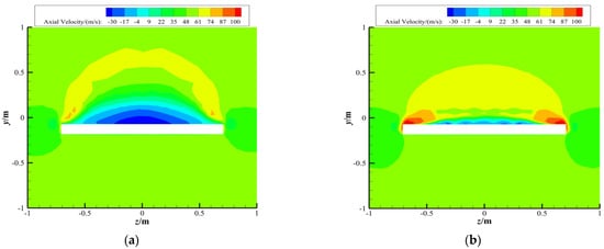 Axial velocity contours at the x = −0.15 m section at Ma = 0.2 and AOA = 26°: (a) NACA 643-618 clean wing; (b) coupled configuration without fan suction effect.