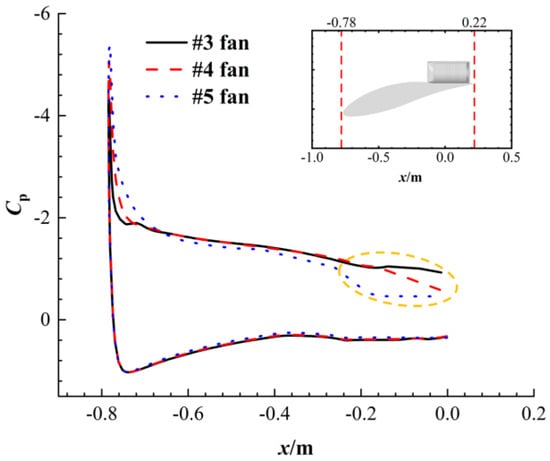 Figure 18 and Figure 19 present the pressure distribution curves and axial velocity profiles at different spanwise positions when the Mach number is 0.4 and the angle of attack is 26°, respectively. It can be observed that the pressure only varies along the spanwise direction in the areas near the inlets of #3, #4, and # 5, showing an increasing trend in sequence, while it is relatively uniformly distributed along the spanwise direction in other areas. This is consistent with the phenomenon in Figure 16b, where there is a spanwise movement trend in the flow near the inlets of the ducted fans, forming separation spiral vortices. The study of the airflow conditions upstream of each ducted fan reveals that the airflow upstream of fan #3 has undergone severe separation accompanied by a large-scale recirculation zone. The recirculation zone is concentrated in the interval of 10–60% of the wing chord length, corresponding to the coordinate range from x = −0.7 m to x = −0.2 m, and the separation is most significant near the position of 50% of the wing chord length (x = −0.3 m). It is worth noting that when being closer to the inlet of fan #3, the degree of airflow separation gradually decreases due to the acceleration effect brought about by the fan suction. Compared with fan #3, the separation degree of the airflow upstream of fan #4 is significantly weakened, and the range of the recirculation zone is reduced, while the airflow upstream of fan #5 has almost no separation. This is because fans #1 and #5 are closest to the wingtip positions and can ingest more wingtip fluid to compensate for their required flow rate. Therefore, their ability to resist the reduction in fan flow rate caused by airflow separation is the strongest. As a result, when the flight Mach number increases, the thrust they generate also increases. In contrast, fan #3 is the farthest from the wingtip position, and the airflow it inhales from the wingtip is far from enough to compensate for the sharp reduction in fan flow rate caused by airflow separation. Therefore, when the flight Mach number is 0.4, its performance drops significantly.