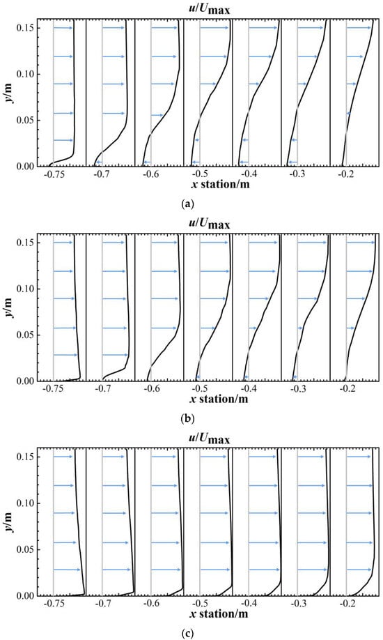 Axial velocity profile upstream of the inlet of the ducted fan at Ma = 0.4 and AOA = 26°: (a) fan #3; (b) fan #4; (c) fan #5.