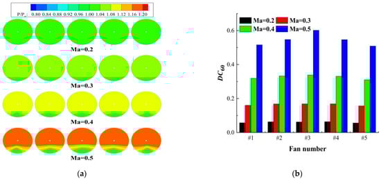 The perspective in the figures is from the fan inlet to the fan outlet, and clockwise is the positive direction. It can be seen from Figure 20 that as the flight Mach number increases, the intake uniformity of the ducted fan becomes worse. The total pressure loss at the inlet section becomes more severe, and the total pressure distortion area also expands accordingly. Taking fan #3 as an example, the value at a flight Mach number of 0.5 has increased by 867% compared with that at a flight Mach number of 0.2.
