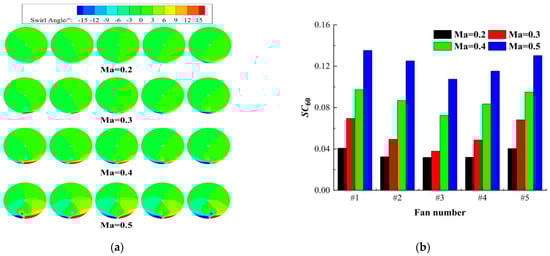 where denotes the total pressure, denotes the dynamic pressure, and denotes the secondary flow velocity. Figure 20 and Figure 21, respectively, show the variation in the total pressure distortion and the swirl distortion at the inlet section (1.4 times the axial chord length from the leading edge of the fan rotor) with the flight Mach number at AOA = 21°. And the swirl angle is defined as the ratio of the circumferential velocity component of the airflow at the fan inlet to the axial velocity component . A positive swirl angle indicates a positive pre-swirl, while a negative swirl angle represents a negative pre-swirl. The specific expression is as follows: