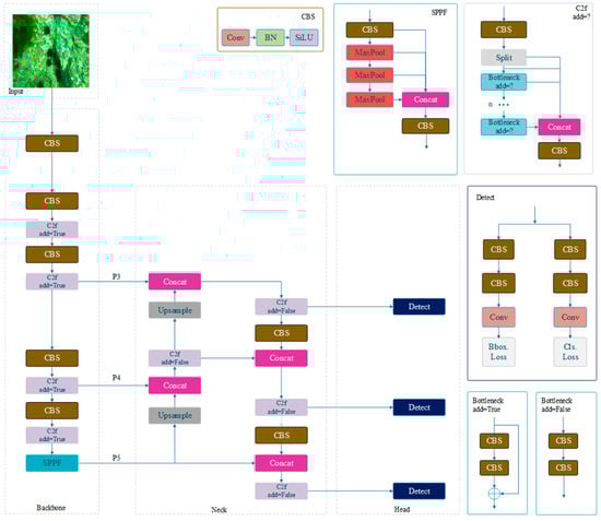 The YOLOv8 architecture consists of four fundamental components: Input, Backbone, Neck, and Head. The Input layer processes target photos by executing data augmentation and additional preprocessing techniques to improve image variety. The Backbone, tasked with feature extraction, comprises Conv, C2f, and SPPF modules. The Neck, consisting of Feature Pyramid Networks (FPN) [] and Path Aggregation Network (PAN) [], improves the integration and application of multi-scale feature layers, facilitating a more comprehensive feature representation. The detection head incorporates three layers at different scales to accurately predict objects of varying sizes, including parallel branches for classification and regression functions. The network architecture of YOLOv8 is illustrated in Figure 1.