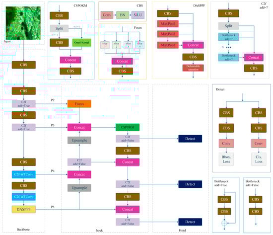 First, the cascaded convolution module WTconv based on wavelet transform was introduced to enhance the receptive field and strengthen the feature extraction capabilities of the backbone network. Second, a Deformable Attention-based SPPF (DASPPF) module was developed to dynamically capture marine benthos objects’ geometric variations while suppressing irrelevant features through deformable attention mechanisms. Finally, the original neck structure was re-engineered as SF-PAFPN by integrating the Focus module with the novel CSPOKM module, enabling effective multi-level feature fusion to boost small-object detection. The complete architecture of WDS-YOLO is illustrated in Figure 2.