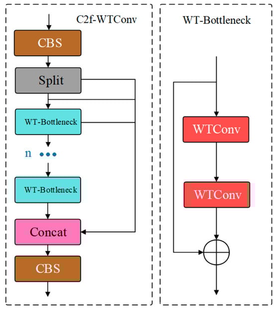 Figure 3 illustrates an example of the WTConv module employing a 2-level WT and a 3 × 3 convolutional kernel. The 2-level wavelet decomposition can provide a sufficiently large receptive field without excessively increasing computational complexity, while the 3 × 3 convolutional kernel effectively captures local features across each frequency component.