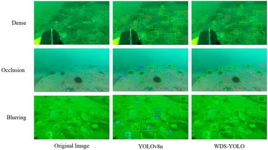 To qualitatively assess the detection performance of the WDS-YOLO algorithm in real-world underwater conditions, we selected three distinct scenarios representing dense distributions, occlusions, and low-visibility conditions. A comparative analysis was performed with the baseline YOLOv8n model, with the results illustrated in Figure 8.