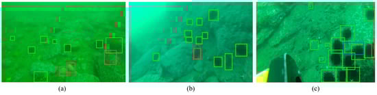 The dataset utilized in this study was obtained from the 2020 Underwater Robot Professional Contest (URPC) [], provided by Peng Cheng Laboratory (Shenzhen, China). It consists of 7543 underwater optical images captured in natural marine environments around Dalian’s Zhangzidao Island. In this dataset, 80% of the images are still shots and 20% of the images were derived from keyframes captured from low-speed cruise video. The dataset contains diverse marine benthos objects with varying morphological characteristics. The dataset comprises five categories: holothurian, echinus, starfish, scallop, and seaweed, and has been widely adopted. As seaweed is not considered a marine benthos species, it was excluded from the prediction tasks in our experiments. After preprocessing, the four target categories contained the following labeled instances: holothurian (6371), echinus (28,624), starfish (9264), and scallop (13,153). The distribution of instances across the training, validation, and test sets is detailed in Table 1, which provides a breakdown of the number of labeled objects for each category. Representative samples from the dataset are shown in Figure 7. The dataset was randomly split into training, validation, and test sets using a 7:1:2 ratio, with all input images adjusted to a consistent resolution of 640 × 640 pixels.