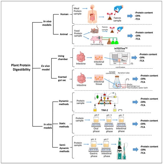 Schematic representation of the methods for assessing plant protein digestibility. (*) adapted from Sitovs and Mohylyuk [29]; (**) adapted from Antal et al. [30]; (***) adapted from Rehman et al. [31].