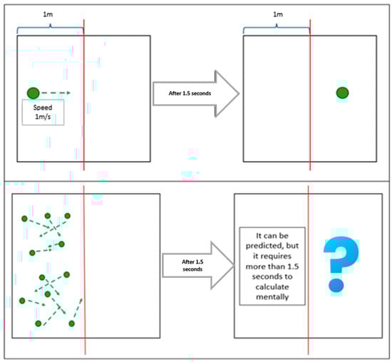 Offensive play is also organized, following predefined movements such as simple progressions, crossings, and one-on-ones, which, in their variability (due to feints, fakes, and players’ physical abilities), generate a certain level of uncertainty. This uncertainty increases in situations involving two-on-ones, two-on-twos, and up to six-on-sixes (or even seven-on-sixes), where the attacking team must adapt to defensive adjustments [29,30]. However, chaos theory, within the framework of general systems theory, redefines “chaos” not as disorder but as a difficulty in predicting outcomes due to high sensitivity to variations within systems. In chaotic systems, small initial variations can generate outcomes that appear random and difficult to anticipate [31]. Mathematical models of chaos theory make it possible, under specific conditions, to predict the future position of an element in a given space if it maintains a constant speed. However, when the number of elements increases, along with variability in speeds and spatial complexity, the capacity to predict their locations diminishes, rendering the system chaotic (though not necessarily disordered) (Figure 1) [32].