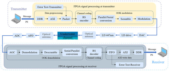 The overall system architecture is illustrated in Figure 1 and mainly consists of signal processing modules (data preprocessing, channel encoding, and modulation/demodulation) implemented on the FPGA, as well as peripheral devices including a digital-to-analog converter (DAC), analog-to-digital converter (ADC), optical antennas, and laser driver circuit. During the communication process, the information intended for transmission is initially written into the DDR by the processing system (PS). Subsequently, the programmable logic (PL) reads and packages the data via the advanced extensible interface (AXI) protocol, completing the data preprocessing. The packetized data are then encoded using RS coding to improve robustness in the complex underwater environment. To generate the baseband signal for modulation, the encoded data are first converted from parallel to serial format and then scrambled to enable the detection of hopping edges, ensuring accurate bit synchronization at the receiver. The scrambled data are modulated and converted to an analog signal using the DAC; this then drives the laser through the laser driver circuit. The laser beam is expanded and collimated before being transmitted through the underwater channel. At the receiver, the APD detector captures the optical signal. The output signal is sampled by the ADC. The sampled signal is demodulated and decoded, and then written back to the DDR via the AXI protocol. The processed data are read by the PS and displayed on a host computer, completing the entire underwater communication process. The specific design principles and analysis of the data preprocessing, channel coding, and modulation/demodulation schemes are as follows.