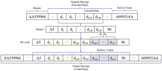 In order to ensure the consistency of the data structure during data transmission, data preprocessing is employed in the system design with the following workflow: First, the overall data are extracted from the DDR using the AXI protocol and then packetized using a specific packet architecture, as illustrated in Figure 2. To clearly define the boundaries of the data packet, a start marker (header) is inserted at the start of the data, while an end marker (end of frame) is appended at the end. Then, the overall data are segmented based on the state machine design, with each set consisting of 239 bytes of data to be encoded. The frame header “A5” is added before each frame as a start flag, which is detected by the encoding module to start the encoding program. The “96” indicates the end of the encoding process for a data set. The “RS_code” in Figure 2 represents a data segment after RS encoding, which has a complete structure facilitating subsequent transmission and decoding processes.