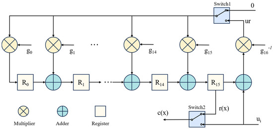 The encoding circuit is illustrated in Figure 3 [46]. The information to be encoded is sequentially input into the circuit. At the start of encoding, “Switch1” is connected to the “ur” terminal, which is responsible for inputting to participate in the subsequent Galois field operations. Meanwhile, “Switch2” is connected to the “u(x)” terminal, which is responsible for outputting the data to be encoded ( to ) sequentially. After the information input is completed, the two switches are toggled, and the generated parity check symbols ( to ) are appended to the last 16 bytes of the data. These parity symbols are then output sequentially along with the original information up to , completing the encoding process.